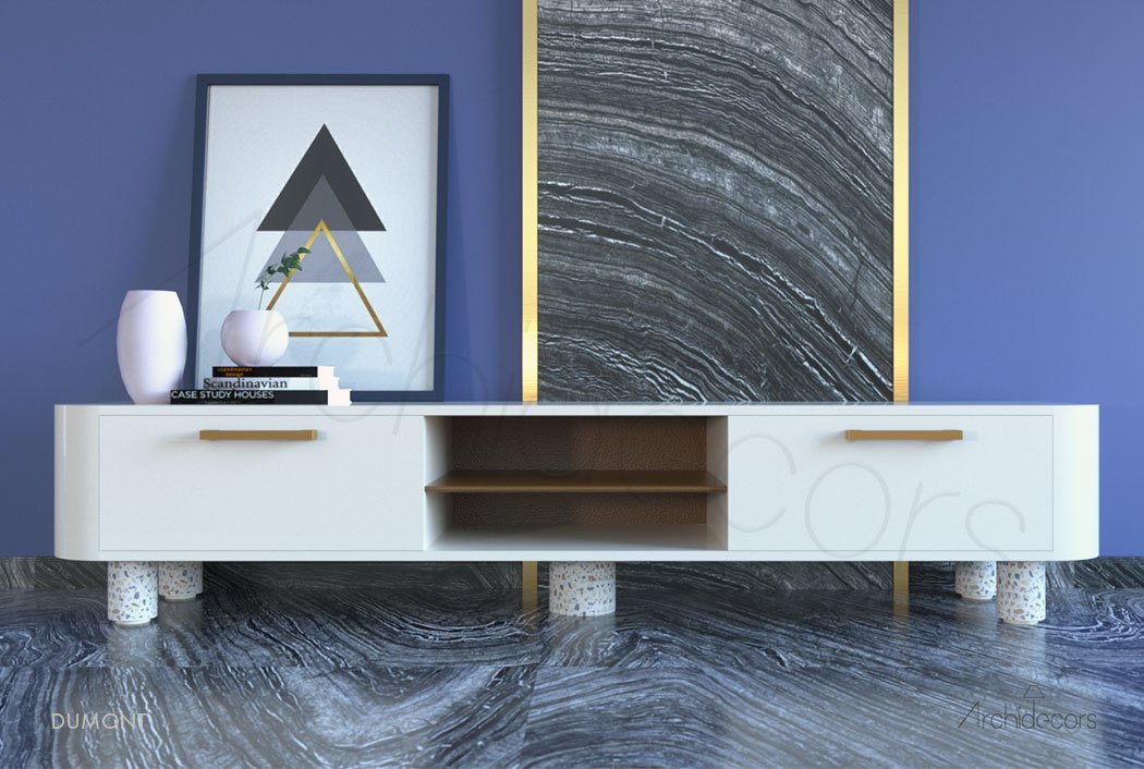 Tasarımcı Kristina Vikovan tarafından Archidecors için özel tasarlanan Dumont No2 TV Ünitesi, birçok farklı ve özel materyali uyum içinde bir arada kullanmaktadır. Ahşap üzeri parlak lake boya, beton ayaklar, pirinç kulp ve deri kaplama orta bölümü ile muhteşem bir tasarım sunuyor. Bu özel parça sağda ve solda birer adet geniş çekmeceleri ile evde depolama alanı ihtiyacınıza da yardımcı olurken ortaya çok şık bir tasarım çıkartıyor. TV ünitesinin orta bölümünde raflı deri kaplama cihaz bölümü mevcuttur. Bu bölüm arkadan açılan delik ile kablo trafiğini sorunsuz şekilde yönetirken cihazların hava sirkülasyonuna yardımcı olur. Sadece Archidecors da.